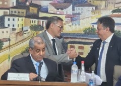 Prefeito e vice se cumprimentam após serem declarados empossados