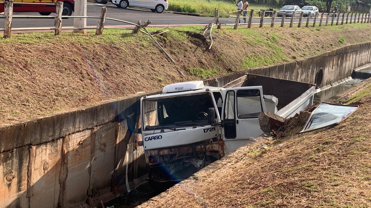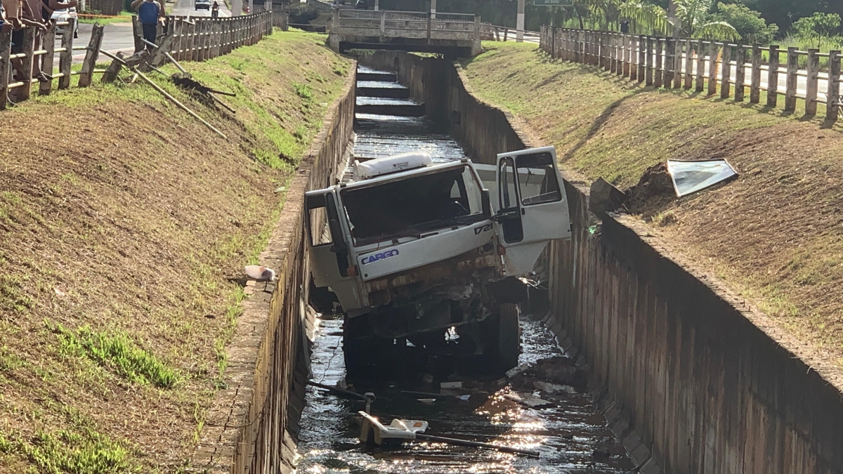 Caminhão descia a Rua Nova Iorque para entrar na Getúlio Vargas quando perdeu o freio e foi parar no canal no centeiro central da via.