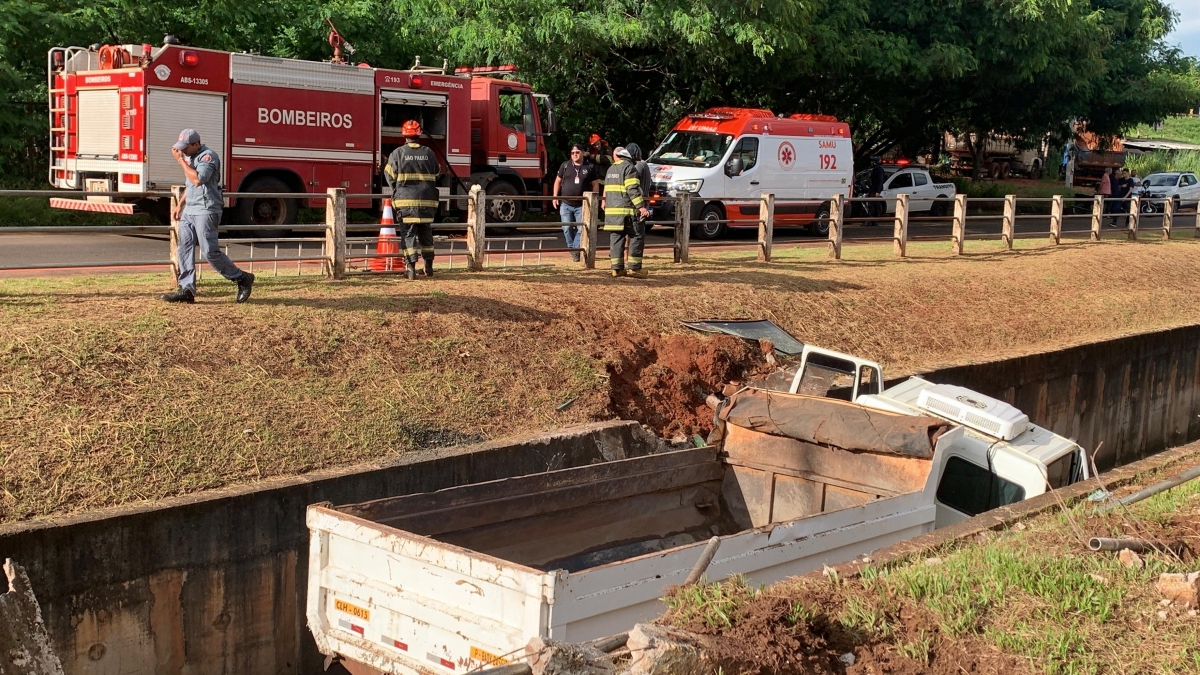 Um caminhão basculante particular foi parar dentro da galeria da Avenida Getúlio Vargas, no Jardim Paulista em Fernandópolis. O acidente ocorreu na tarde desta quinta-feira, por volta das 16h45. O motorista explicou que ao tentar fazer a conversão da Rua Nova Iorque para a Avenida Getúlio, o caminhão perdeu o freio e foi parar dentro do canal da Avenida Getúlio Vargas, após derrubar a guarda de proteção.