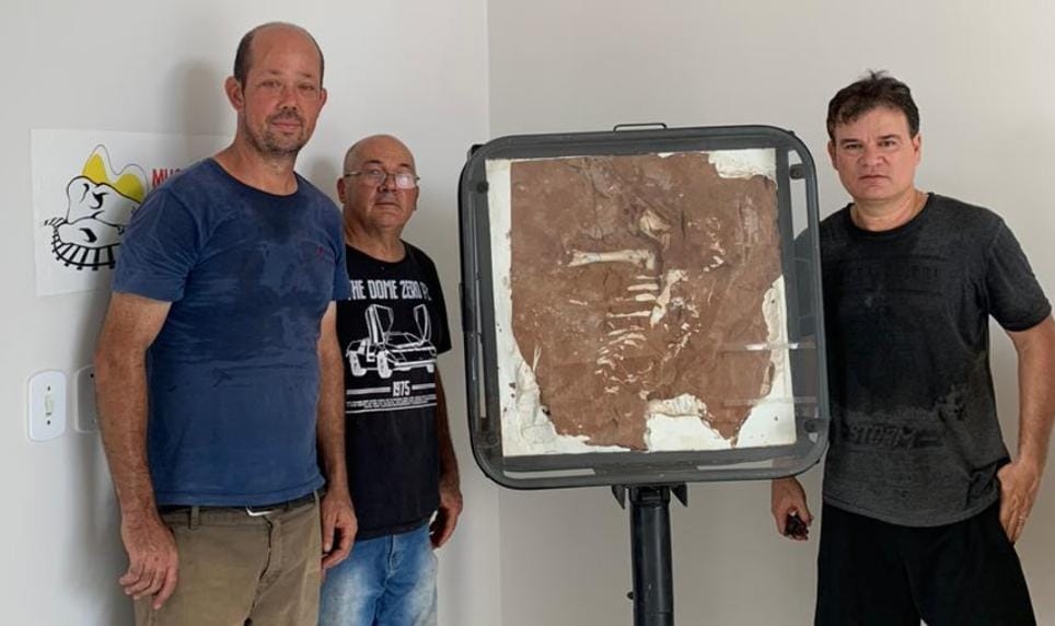 Anízio Vilela Carneiro, Rafael Campos Carneiro e Professor Doutor Carlos Eduardo Maia de Oliveira junto ao fóssil de 80 milhões de anos que passa integrar o acervo do Museu de Fernandópolis