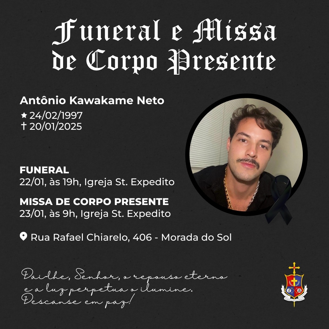 A família do estudante fernandopolense Antônio Kawakame Neto, que morreu na Bahia onde cursava Medicina, divulgou que as cerimônias fúnebres serão iniciadas nesta quarta-feira, 22, às 19 horas na Igreja Santo Expedito, zona oeste da cidade. As cerimônias prosseguem nesta quinta-feira, 23, com a celebração da Missa de Corpo Presente pelo padre Igor Kawakame Rathlef, pároco da Paróquia Santo Expedito e primo de Neto. O sepultamento ocorrerá em seguida.