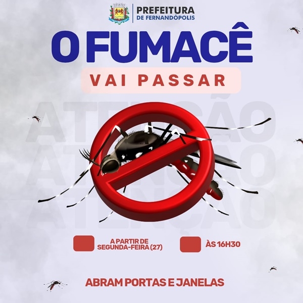 A Prefeitura de Fernandópolis distribuiu nota neste sábado, 25, para informar que o carro do “fumacê” para pulverização ambiental destinado a combater a infestação do mosquito aedes aegypti, transmissor da dengue, começará a circular na próxima segunda-feira, 27.