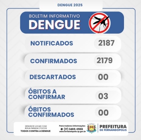De acordo com os números divulgados, os casos notificados são 2.187 e os confirmados 2.179. A cidade é a terceira da região em casos de dengue ficando atrás apenas de Araçatuba e Rio Preto.