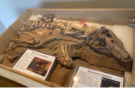 Imagem do Baurusuchus pachecoi juvenil em exposição no Museu de Paleontologia de Fernandópolis. Foto: Prof. Dr. Carlos Eduardo Maia de Oliveira.