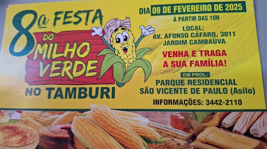 Domingo, dia 9 de fevereiro, o Parque Residencial São Vicente de Paulo, o nosso “Asilo” realizará a oitava edição da Festa do Milho a partir das 10 horas, no Recanto do Tamburi. A renda será toda revertida para a manutenção da entidade que assiste idosos. “Esperamos superar a receita dos últimos eventos. É uma receita importante para as contas da entidade”, destacou o novo presidente do Parque Osmir Silva.