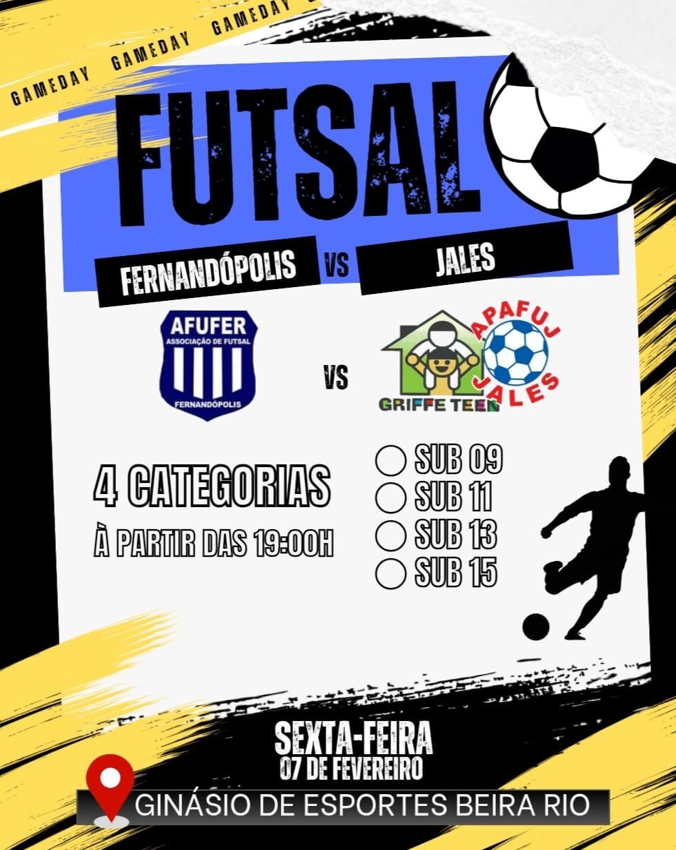A festividade esportiva começa na sexta-feira (07) com partidas de futsal, envolvendo quatro categorias: sub-09, sub-11, sub-13 e sub-15. O confronto será entre as equipes de Fernandópolis e Jales, com início às 19h.