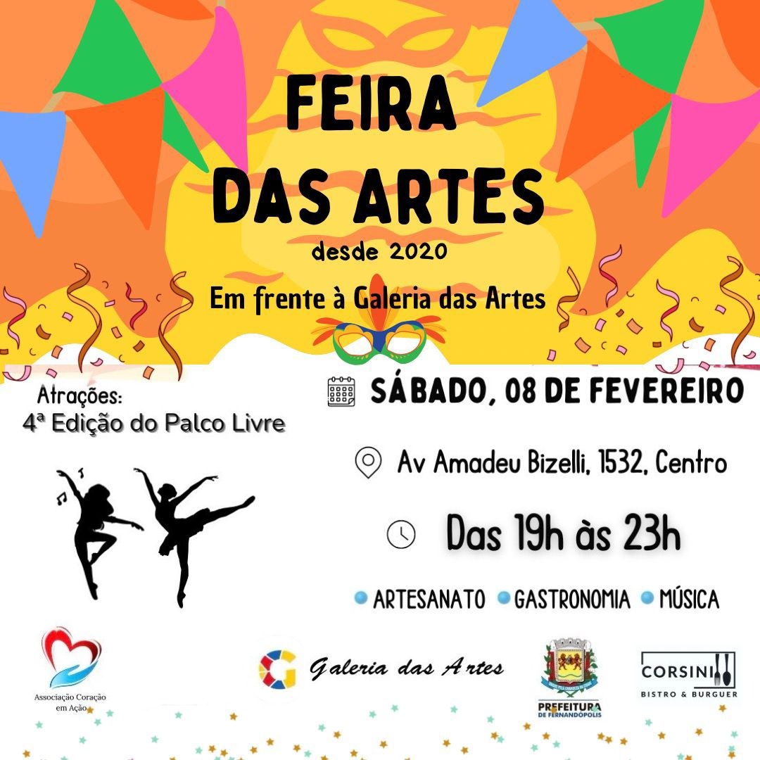 A Feira das Artes será realizada neste sábado (08) em Fernandópolis, trazendo uma programação cultural diversificada para a população. O evento acontecerá na Avenida Amadeu Bizelli, 1532, no centro, em frente à Galeria das Artes, das 19h às 23h.
