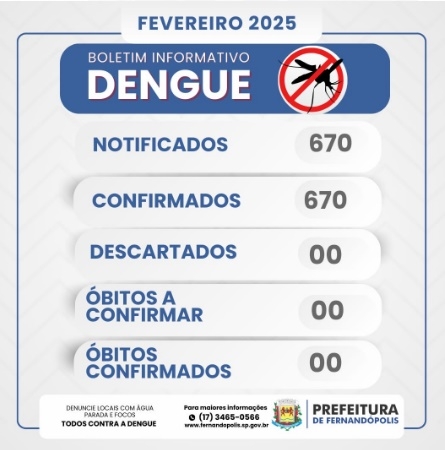 A Secretaria de Saúde divulgou nesta quinta-feira,13, que Fernandópolis chegou a 670 casos positivos de dengue só no mês de fevereiro.
