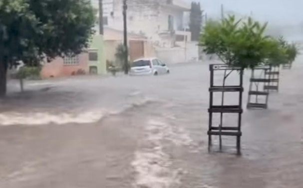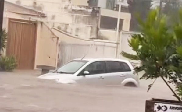 Carro ficou praticamente submerso na Avenida Manoel Marques Rosa nas proximidades da Escola Objetivo