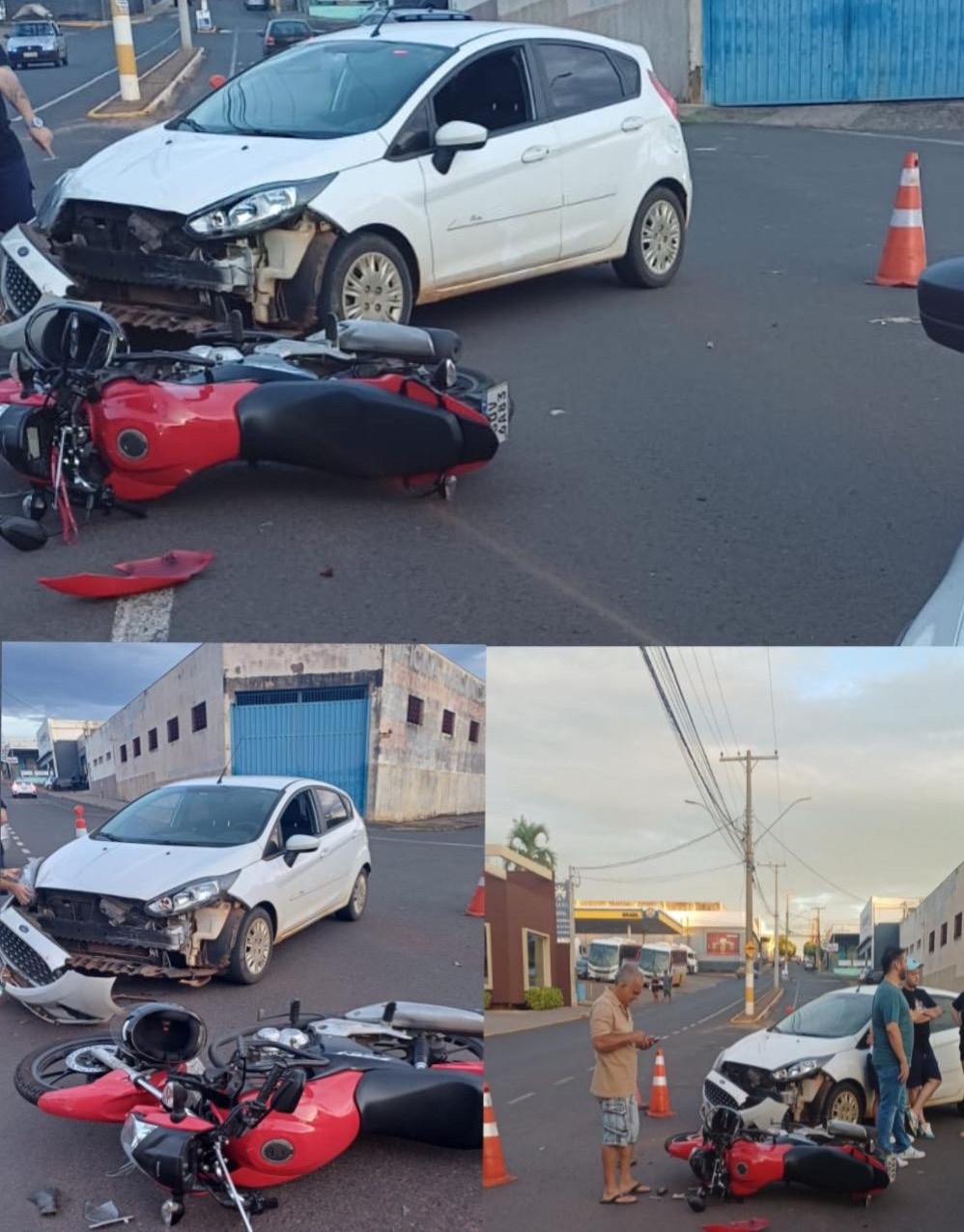 Um acidente entre um carro e uma moto foi registrado em Fernandópolis por volta das 18h55 desta sexta-feira (14) no cruzamento das avenidas Brasil e Brasília. Segundo informações, a condutora de uma moto Honda vermelha seguia no sentido bairro quando um veículo Ford Fiesta branco não respeitou a sinalização de pare e cruzou a via, resultando em uma colisão frontal.
