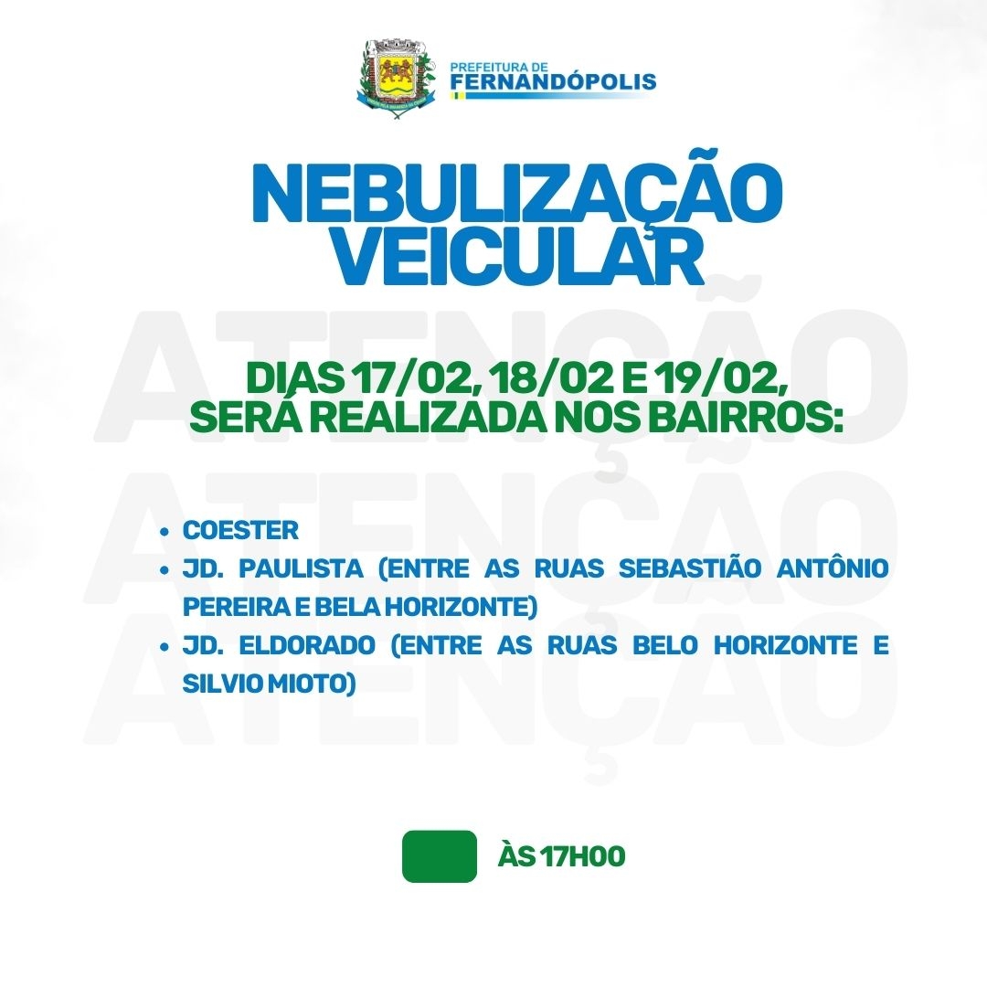 Nos dias 17, 18 e 19 de fevereiro, a nebulização será realizada nos bairros Coester, Jardim Paulista (entre as ruas Sebastião Antônio Pereira e Belo Horizonte) e Jardim Eldorado (entre as ruas Belo Horizonte e Silvio Mioto). Já nos dias 19, 20 e 21 de fevereiro, a aplicação ocorrerá nos bairros Jardim Rosa Amarela, Jardim Pôr do Sol e Jardim Independente (entre as ruas Amadeu Bizelli e Pará).