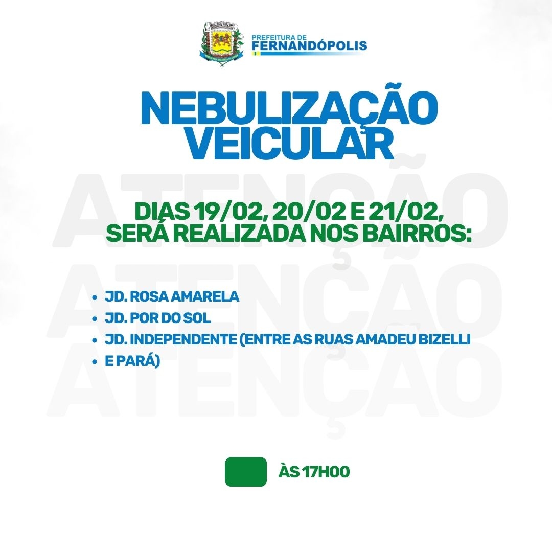 A Secretaria Municipal de Saúde, retoma a nebulização veicular para combater o mosquito Aedes aegypti, transmissor da dengue. A ação consiste na aplicação de inseticida por meio de um aparelho acoplado a um veículo especializado e acontecerá a partir das 17h.