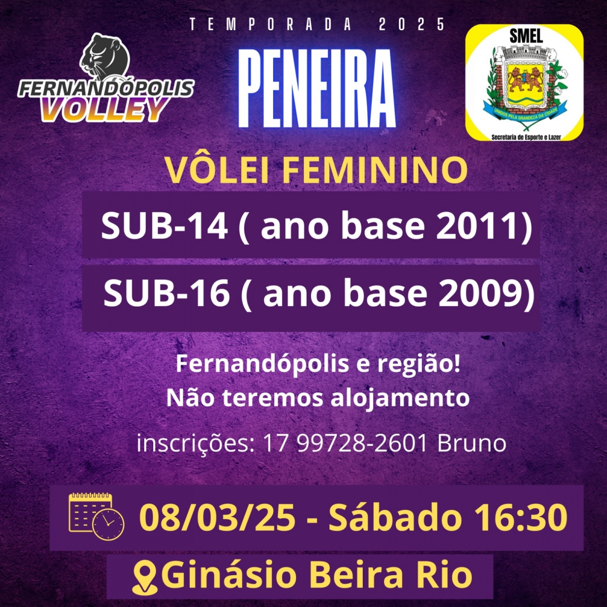 Está marcado para sábado, 8 de março, no Ginásio Beira Rio, a seletiva de vôlei feminino para a formação das equipes das categorias Sub-14 e Sub-16, a partir das 16h30, e é voltado para jovens nascidas entre 2009 e 2013. O evento está sendo organizado pela Secretaria de Esportes e Lazer de Fernandópolis.