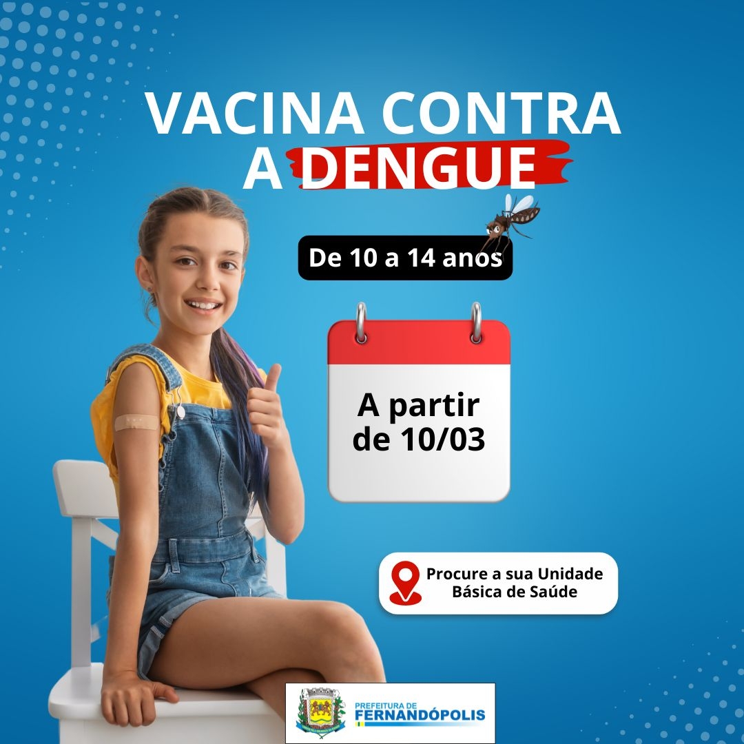 A Secretaria Municipal de Saúde, por meio do Departamento de Vigilância em Saúde, informa que a vacina contra a dengue, Qdenga, estará disponível para crianças e adolescentes de 10 a 14 anos a partir de segunda-feira (10).