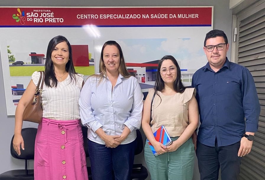 Gerente e professor Eduardo Machado com as enfermeiras Daniela Tiano (coordenadora da UPA) e Geisa Laisa de Morais (coordenadora do SAMU) recebidos pela diretora do Departamento de Urgência da Secretaria Municipal da Saúde de Rio Preto, enfermeira Ligia Cavassani.