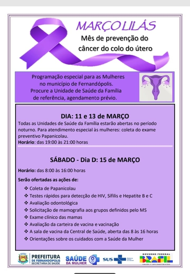 O “Março Lilás”, que já teve horário noturno no dia 11 para coleta do exame preventivo Papanicolau, repetirá a dose nesta quinta-feira, 13. O horário é das 19 às 21 horas e é necessário fazer o agendamento prévio.