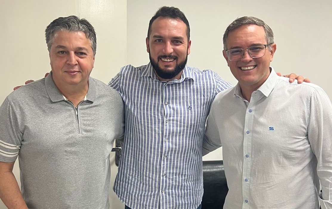 Henrique Vieira, ladeado pelo vice-prefeito Marcos Mazeti e o prefeito João Paulo Cantarella de Fernandópolis