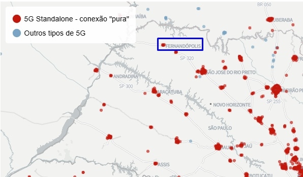 No mapa, Fernandópolis é uma das cidades da região que já disponibiliza o sinal 5G puro