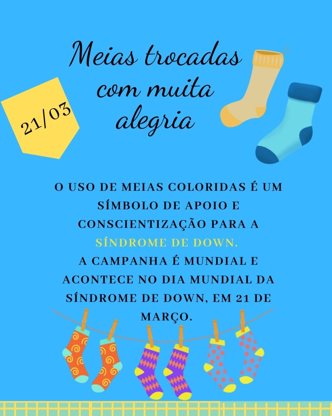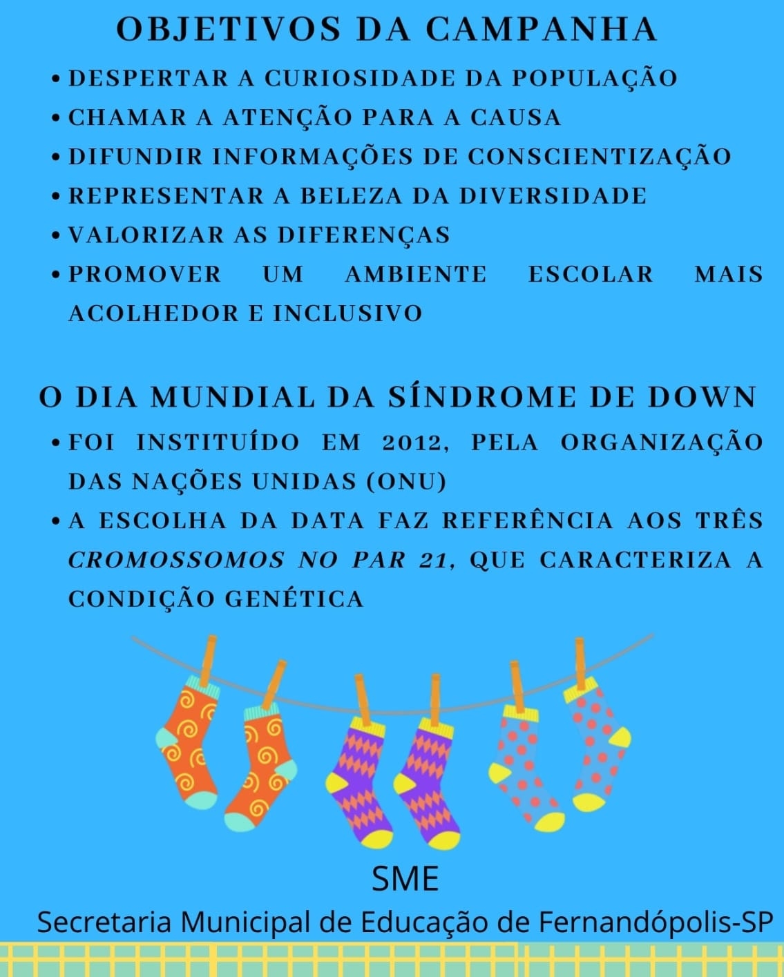 A campanha propõe às pessoas nesta sexta-feira, 21 de março, vestir suas meias mais coloridas para mostrar seu apoio à comunidade da Síndrome de Down. E convida a tirar uma foto das suas meias, compartilhar nas redes sociais e marcar a @prefeiturafernandopolisoficial.