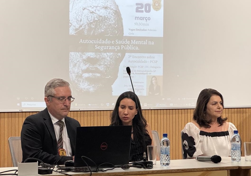 No evento organizado pela Delegacia Seccional de Fernandópolis ocorreram as palestras da médica psiquiatra Amanda Careno e da psicóloga Edilaine Sanches Sano no auditório da Universidade Brasil.