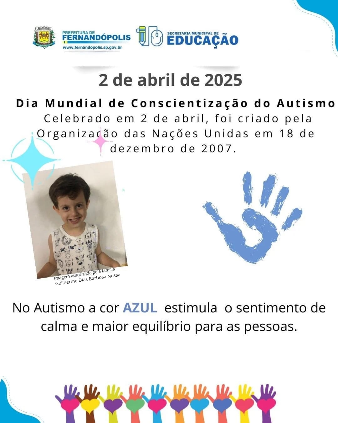 A Secretaria Municipal de Educação de Fernandópolis promove nesta quarta-feira a ação “Vista Azul”, campanha para marcar o Dia Mundial de Conscientização do Autismo”. A ação já teve adesão de funcionários de outros setores da administração.