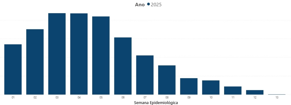Gráfico mostra a evolução dos casos de dengue em Fernandópolis com picos em janeiro e fevereiro e queda a partir de março