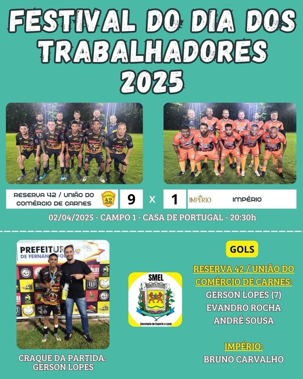 Fechando a noite, a equipe do Reserva 42/União do Comércio de Carnes protagonizou a maior goleada do torneio até o momento, vencendo o Império por 9 a 1. O grande nome da partida foi Gerson Lopes, que balançou as redes incríveis sete vezes, levando a torcida ao delírio e garantindo o prêmio de melhor jogador do duelo.
