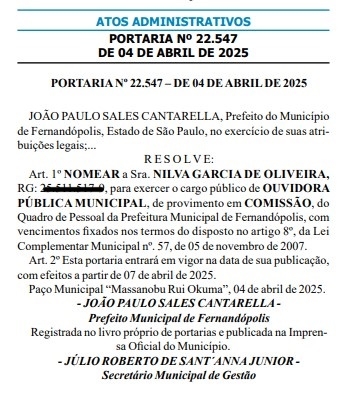 Pela primeira vez, desde sua criação em 2007, a Ouvidoria da Prefeitura de Fernandópolis será comandada por uma mulher. Nilva Garcia de Oliveira, a segunda mais votada na lista tríplice apresentada ao prefeito João Paulo Cantarella foi nomeada nesta sexta-feira, 4. A portaria (veja abaixo) foi publicada na edição desta sexta-feira do Diário Oficial Eletrônico. O mandato de Ouvidor é de quatro anos. Na mesma edição foi publicada a exoneração do Ouvidor Edmar de Oliveira que esteve à frente da Ouvidoria desde 2017.