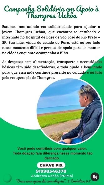 Gostaria de pedir, de coração, que as pessoas se solidarizem com essa causa. Todos os dias vemos histórias como essa acontecendo com outras famílias, mas quando atinge a nossa, o impacto é muito mais profundo e doloroso. A Thamyres é uma jovem cheia de vida, amorosa e muito querida por todos nós, e sua mãe tem enfrentado essa situação com muita coragem, mesmo longe de casa e da sua base. Qualquer ajuda, por menor que pareça, faz uma enorme diferença nesse momento tão difícil. Seja com uma doação, uma oração ou compartilhando essa campanha, toda forma de apoio é um gesto de amor. Que Deus abençoe cada um que se dispõe a ajudar. Muito obrigada, de coração