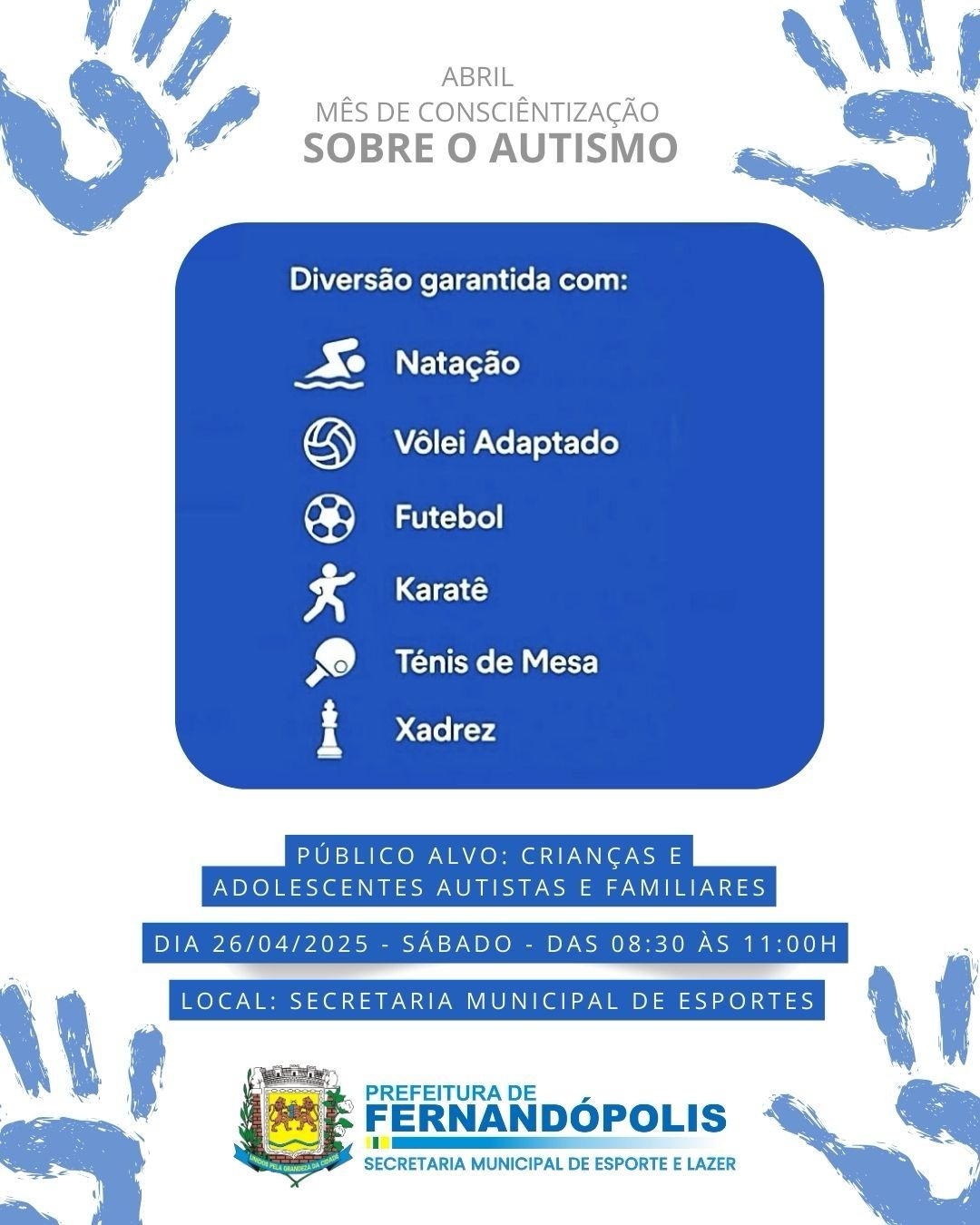 A Prefeitura de Fernandópolis, por meio da Secretaria Municipal de Esportes e Lazer, promoverá no dia 26 de abril (sábado) o evento “Superação Azul”, voltado para crianças e adolescentes com transtorno do espectro autista (TEA).
