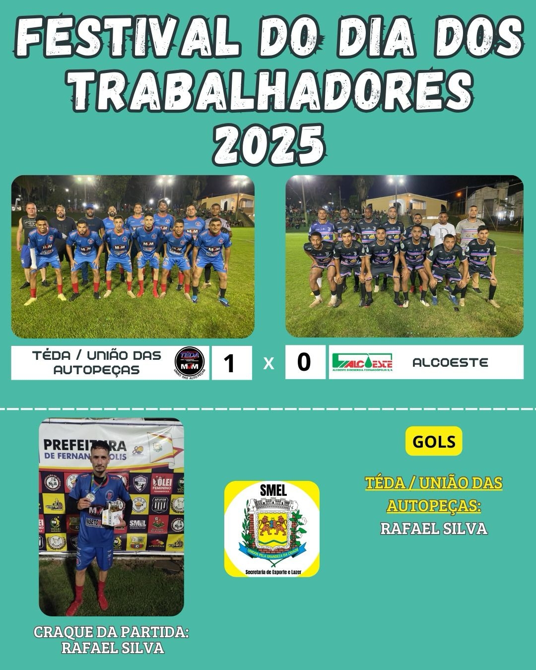 Diante de grande público, a equipe da Téda/União das Autopeças bateu a forte equipe da Alcoeste por 1x0, com gol de Rafael Silva, eleito o craque do jogo.
