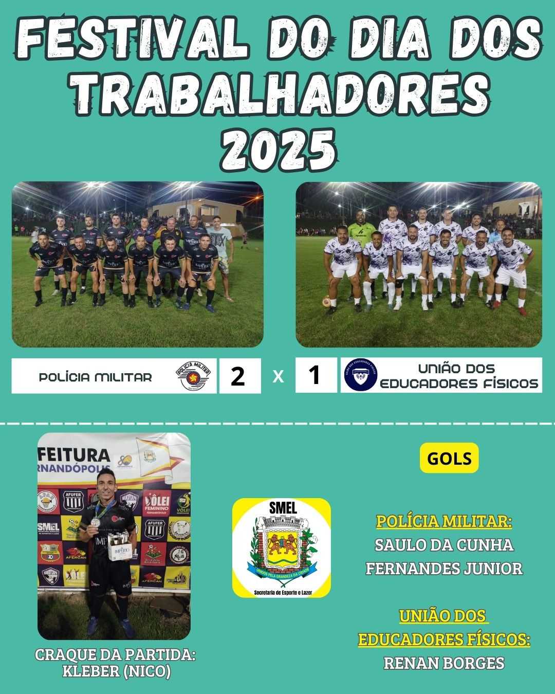 Na segunda partida, a Polícia Militar se garantiu na finalíssima ao bater a União dos Educadores Físicos por 2x1, com gols de Saulo da Cunha e Fernandes Junior. O craque da partida foi Kleber, o “Nico”.