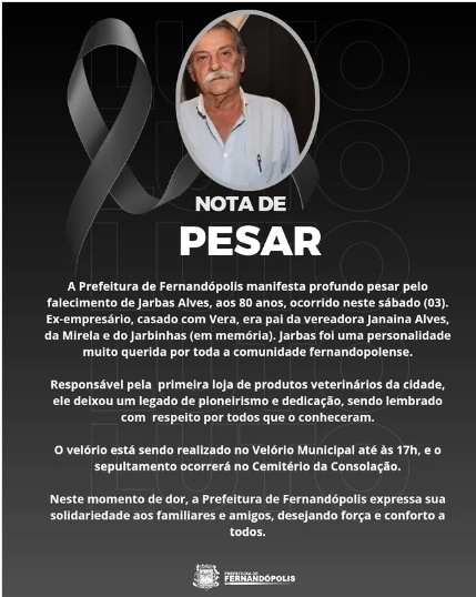 Nas rede sociais, a Prefeitura de Fernandópolis divulgou nota de pesar. Veja abaixo: