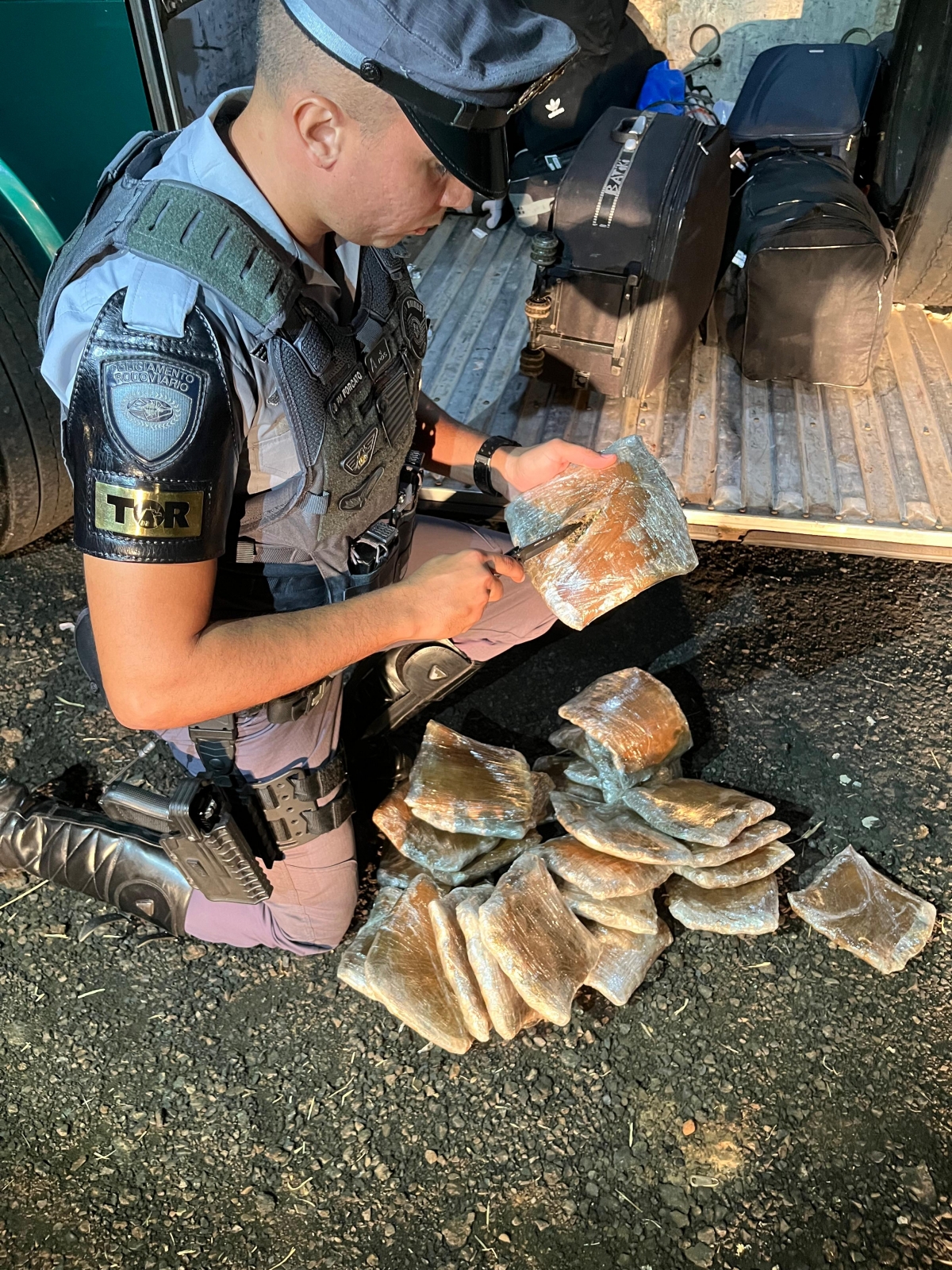 Foi solicitado apoio de policial feminina e constatado que cada uma estava com cinco pacotes de Skunk, conhecida como a super maconha, presos ao corpo, totalizando 25 pacotes, pesando 11,2 kg da droga. Uma das mulheres estava com o filho de três anos de idade, que ficou sob responsabilidade do Conselho Tutelar. Droga apreendida e as traficantes encaminhadas para a Polícia Federal de São José do Rio Preto, permanecendo presas.