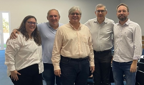 Médico Claudio Guedes Salgado (ao centro) ladeado pela enfermeira Aline Furlan, o médico Márcio Gaggini, o secretário de Saúde José Martins e o médico Mauricio Favaleça