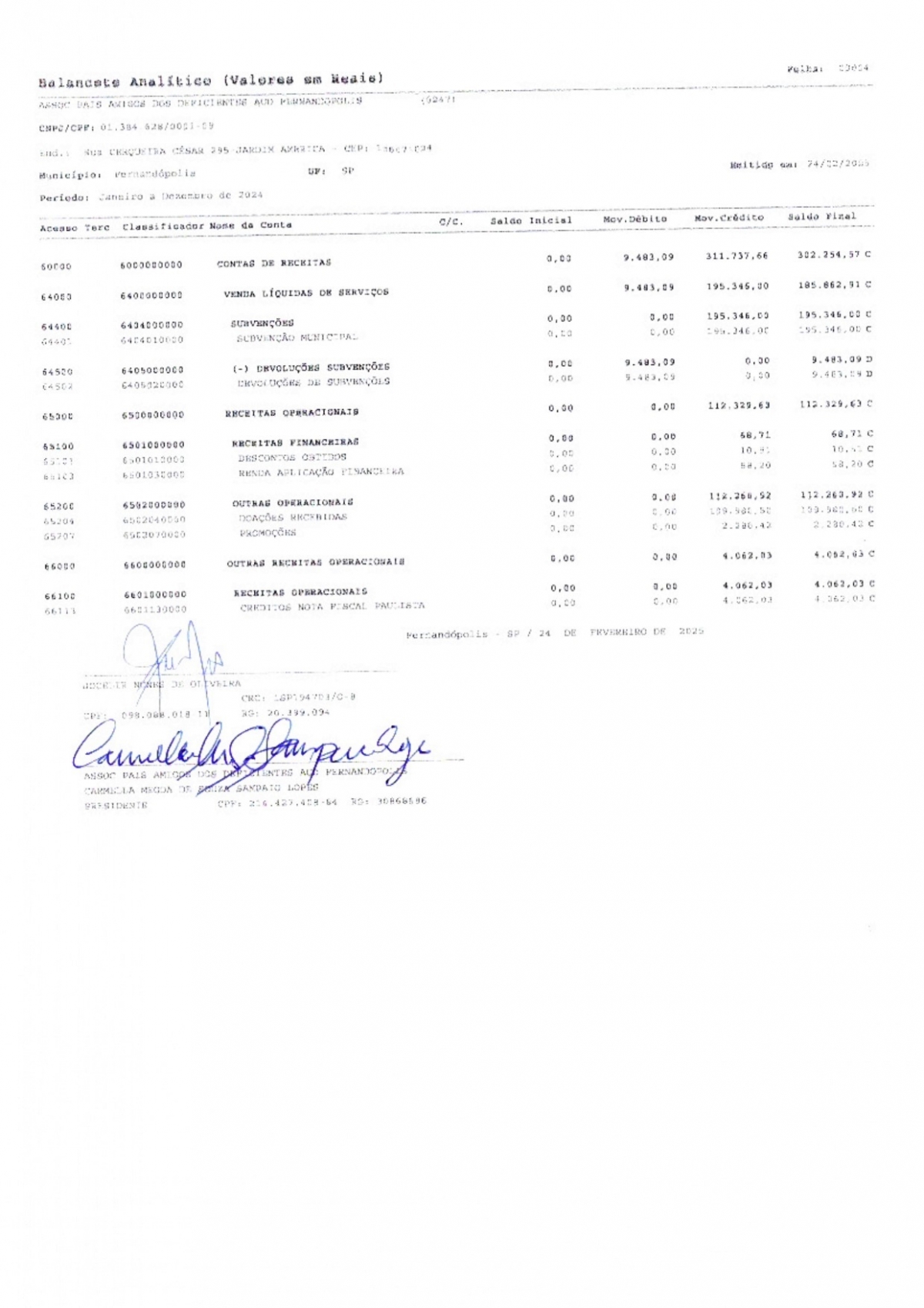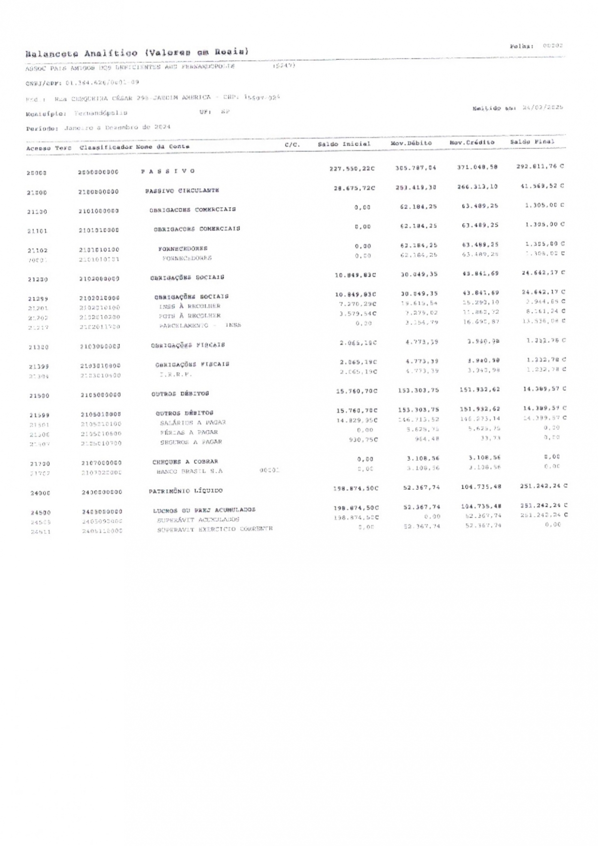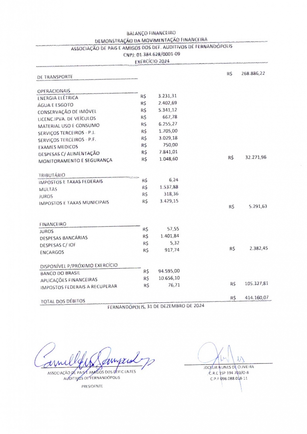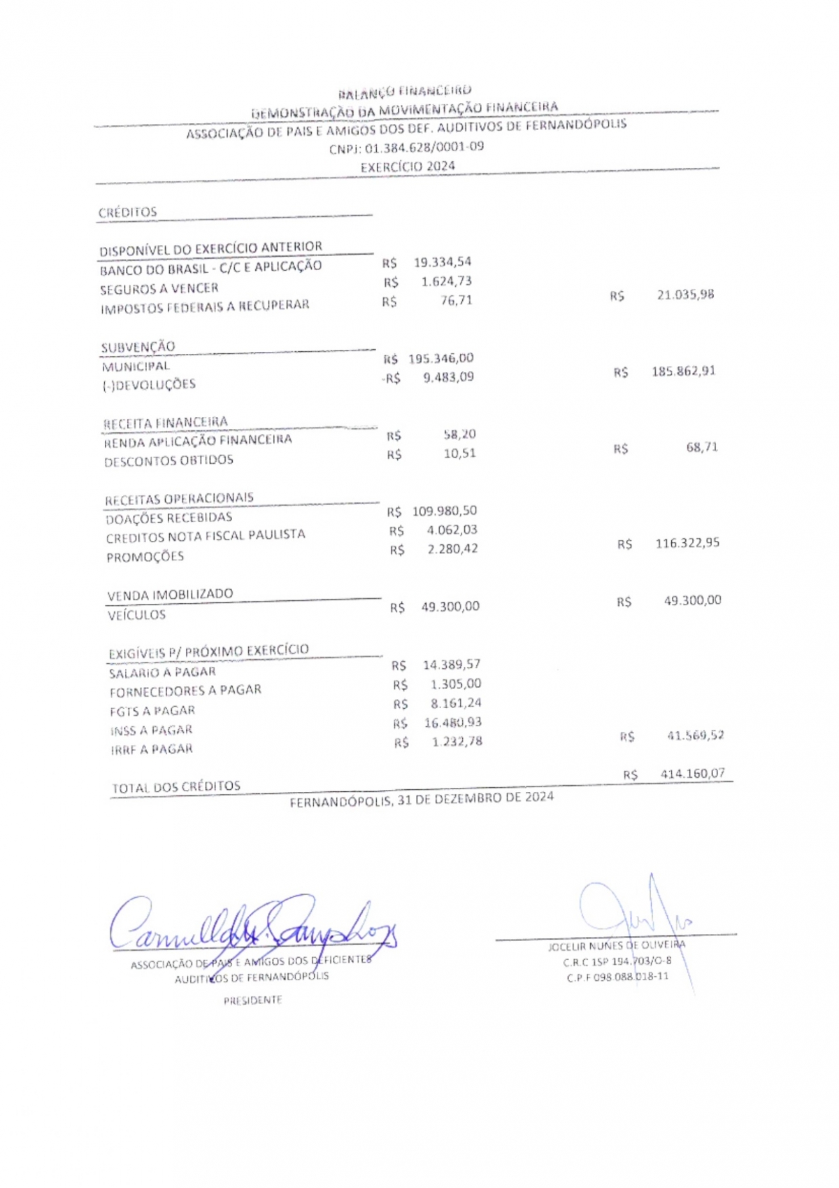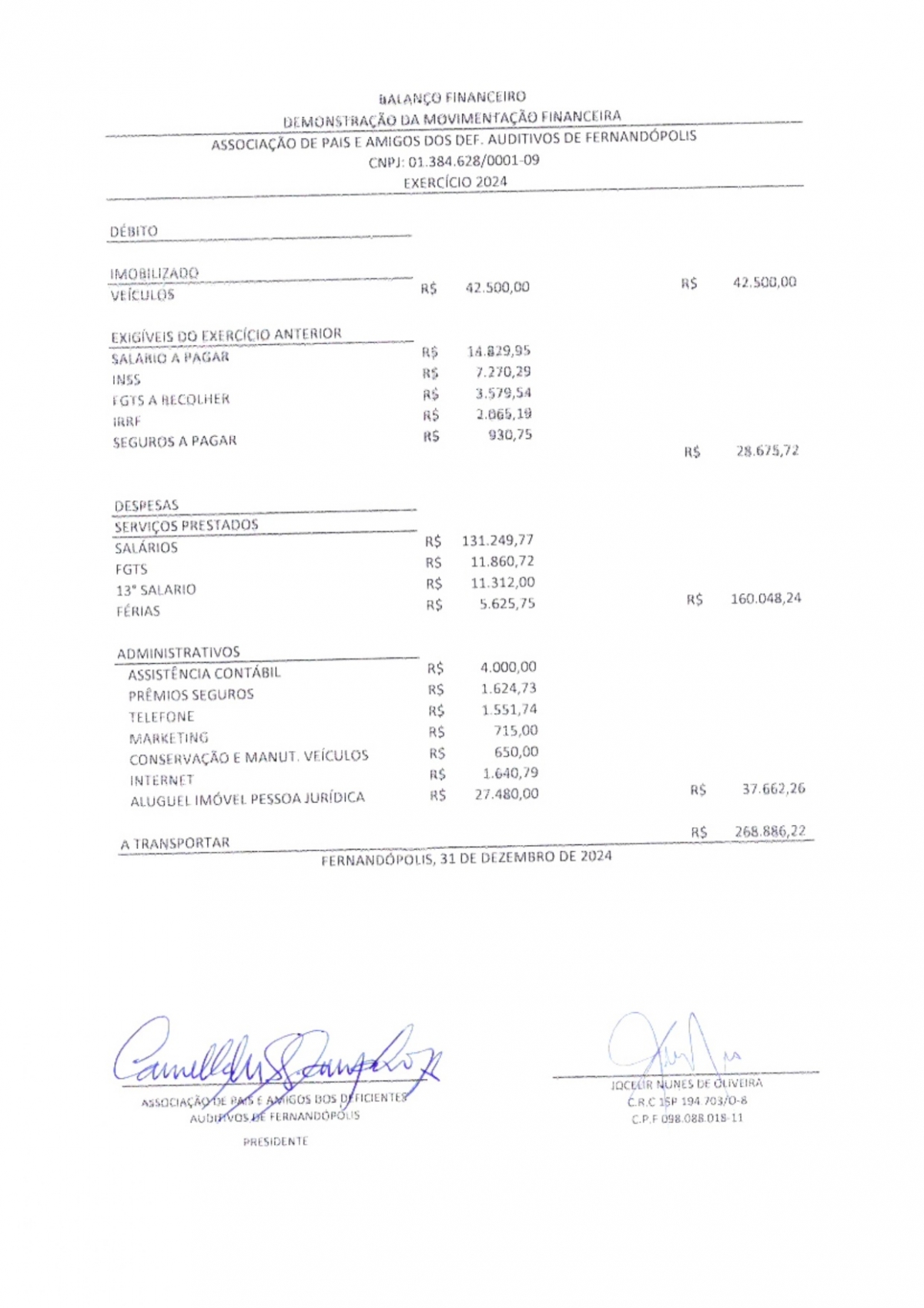 ASSOCIAÇÃO DE PAIS E AMIGOS DOS DEFICIENTES AUDITIVOS DE FERNANDÓPOLIS - BALANCETE 2024