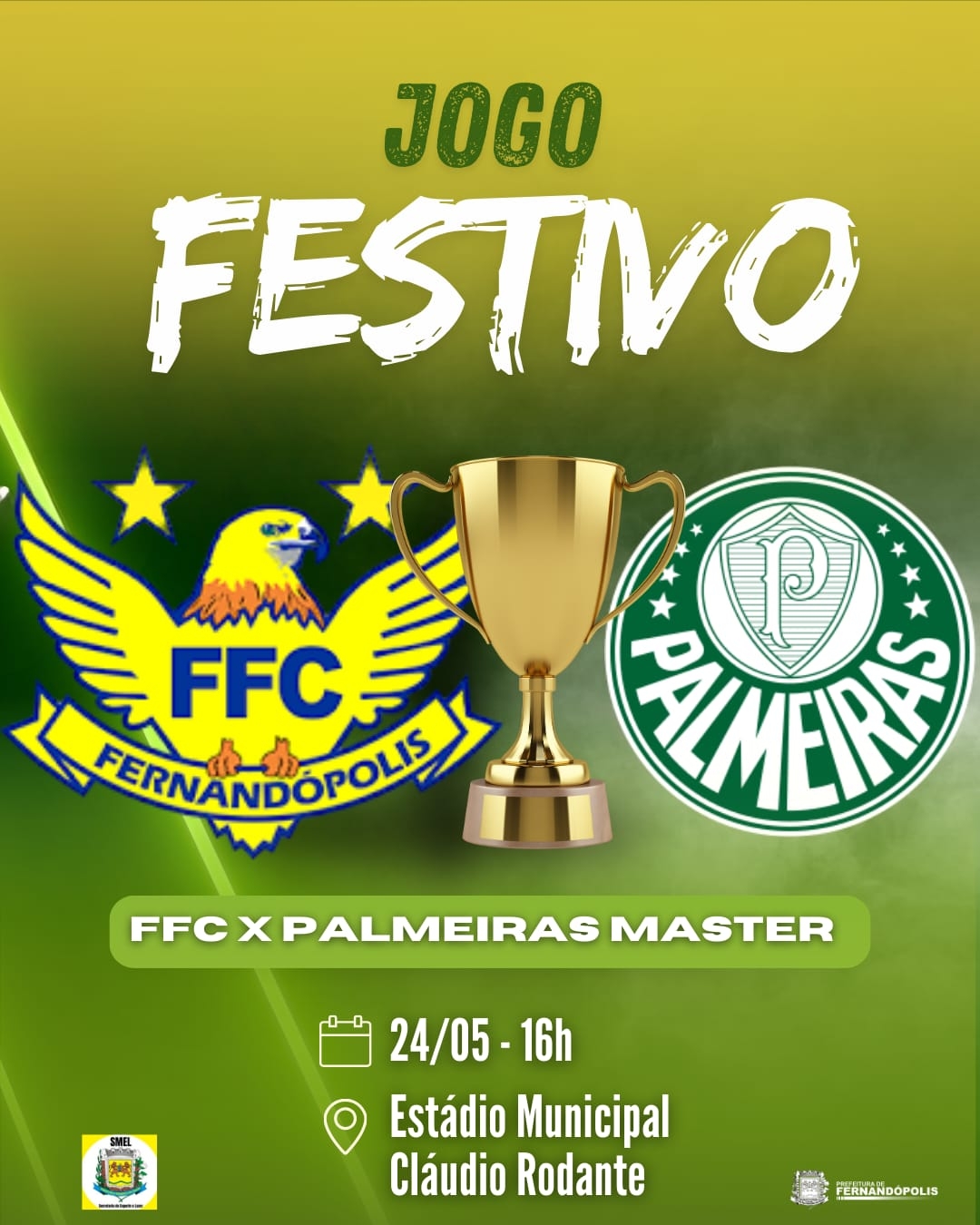 Fernandópolis celebra seus 86 anos com uma programação especial que une esporte e solidariedade. Um dos destaques das comemorações será o jogo entre o Fernandópolis Futebol Clube (FFC) e o time Master do Palmeiras, composto por ex-jogadores do clube. A partida será realizada no dia 24 de maio (sábado), às 16h, no Estádio Municipal Cláudio Rodante.