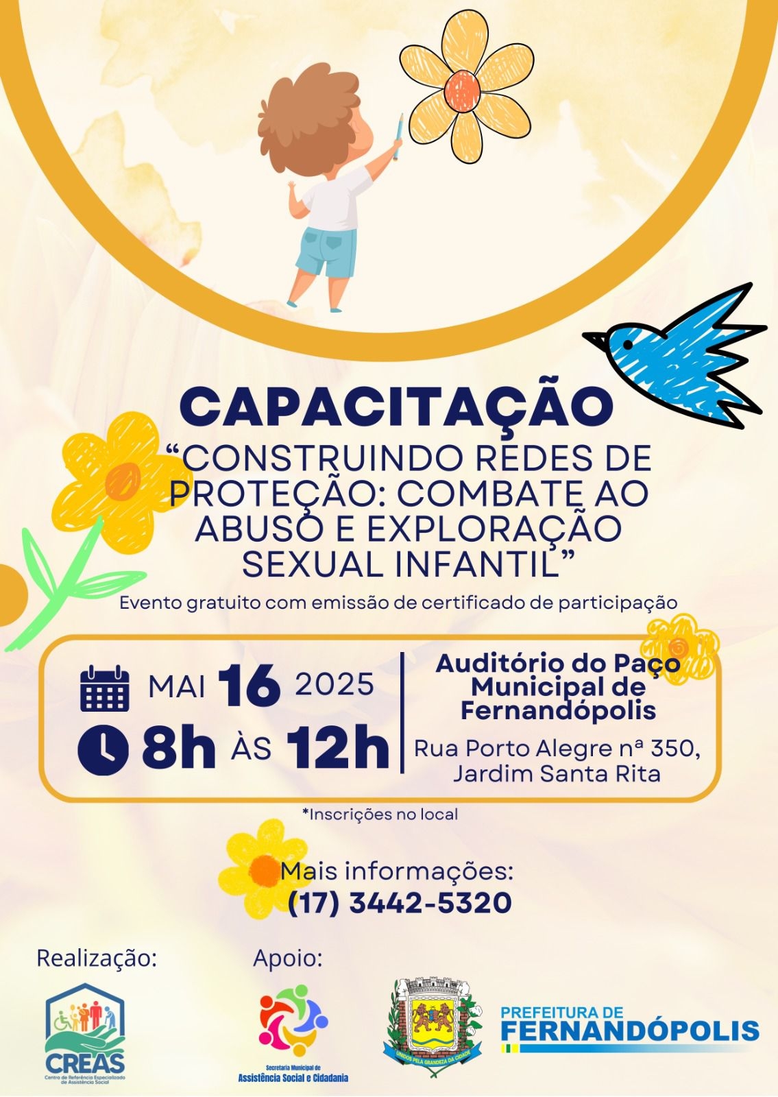 Como parte da mobilização pelo 18 de Maio — Dia Nacional de Combate ao Abuso e à Exploração Sexual de Crianças e Adolescentes — será realizada em Fernandópolis a capacitação “Construindo Redes de Proteção: Combate ao abuso e à exploração sexual infantil”.