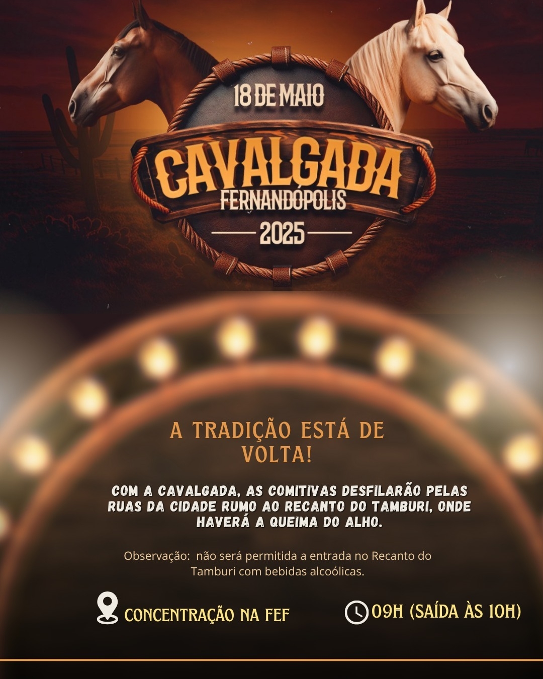 A concentração dos participantes será a partir das 9 horas, na Fundação Educacional (FEF), com saída prevista para as 10 horas. Após o percurso, pelas ruas centrais, a Cavalgada chegará ao Recanto do Tamburi, na Avenida Afonso Cáfaro, onde será realizada a aguardada Queima do Alho para as comitivas participantes.