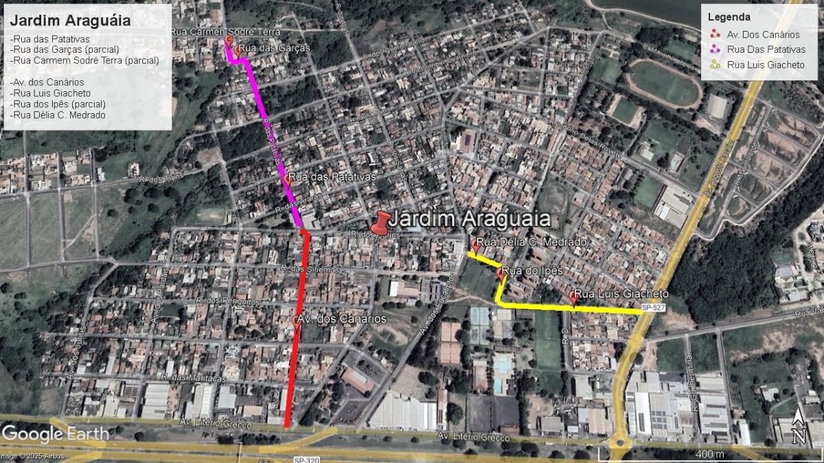 Os serviços terão início pelo bairro Jardim Araguaia, contemplando as seguintes vias: Rua das Patativas, Rua das Garças (parcial), Rua Carmem Sodré Terra (parcial), Avenida dos Canários, Rua Luís Giacheto, Rua dos Ipês (parcial) e Rua Délia C. Medrado.