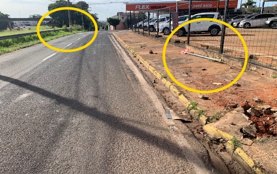 Local do acidente na Avenida Marginal Luiz Brambatti. À direita, a placa arrancada; à esquerda o local onde o carro bateu no poste e na defensa metálica