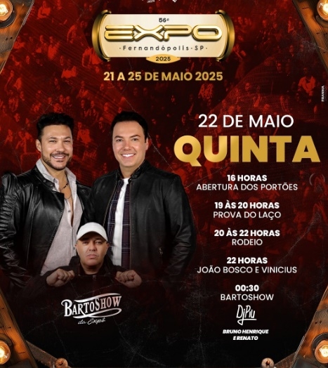 Após o início eletrizante da Expo nesta quarta-feira com o show de Zezé Di Camargo e Luciano (veja entrevista no @difusora91fm), a Expo Fernandópolis tem uma noite recheada de atrações para o público.