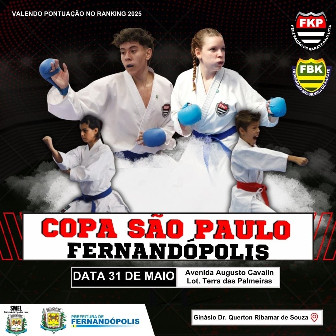 Fernandópolis recebe neste sábado a edição da Copa São Paulo de Karatê. O evento ocorre no Ginásio de Esportes Dr. Querton Ribamar Pereira (Beira Rio) a partir das 8 horas.