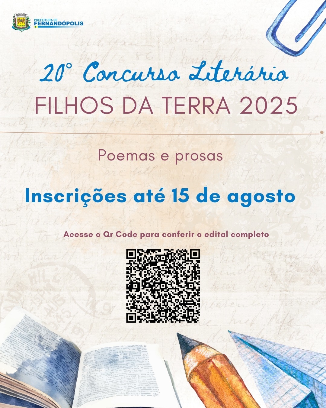 Já estão abertas as inscrições para a 20ª edição do Concurso Literário Filhos da Terra. O concurso é organizado pela Prefeitura de Fernandópolis, através da Secretaria de Cultura e Turismo, com apoio da Secretaria de Educação, Diretoria de Ensino e FEF. As inscrições serão recebidas até o dia 15 de agosto.