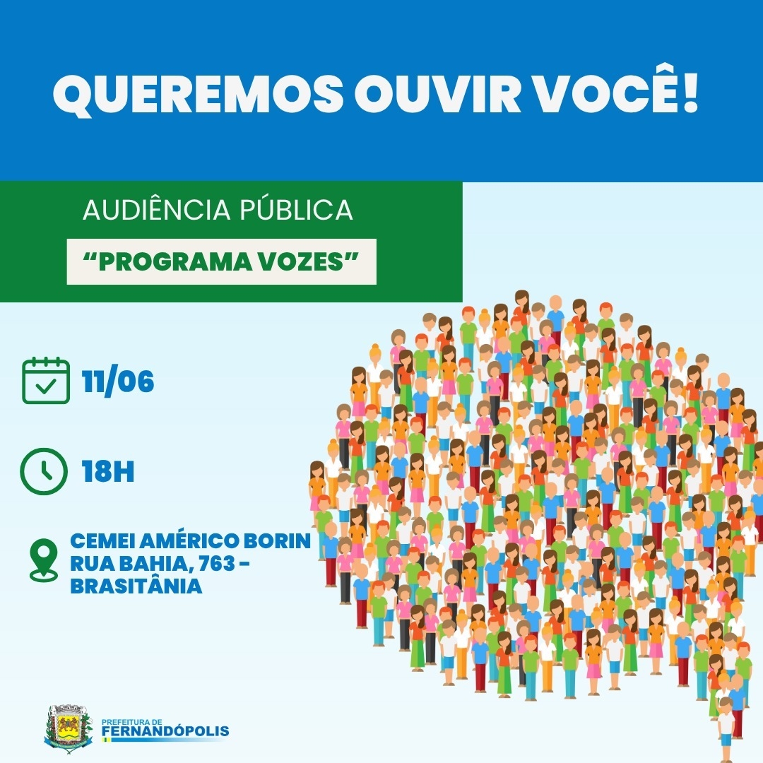 A audiência em Brasitânia acontecerá na CEMEI Américo Borin na quarta-feira, 11 de junho, às 18 horas.