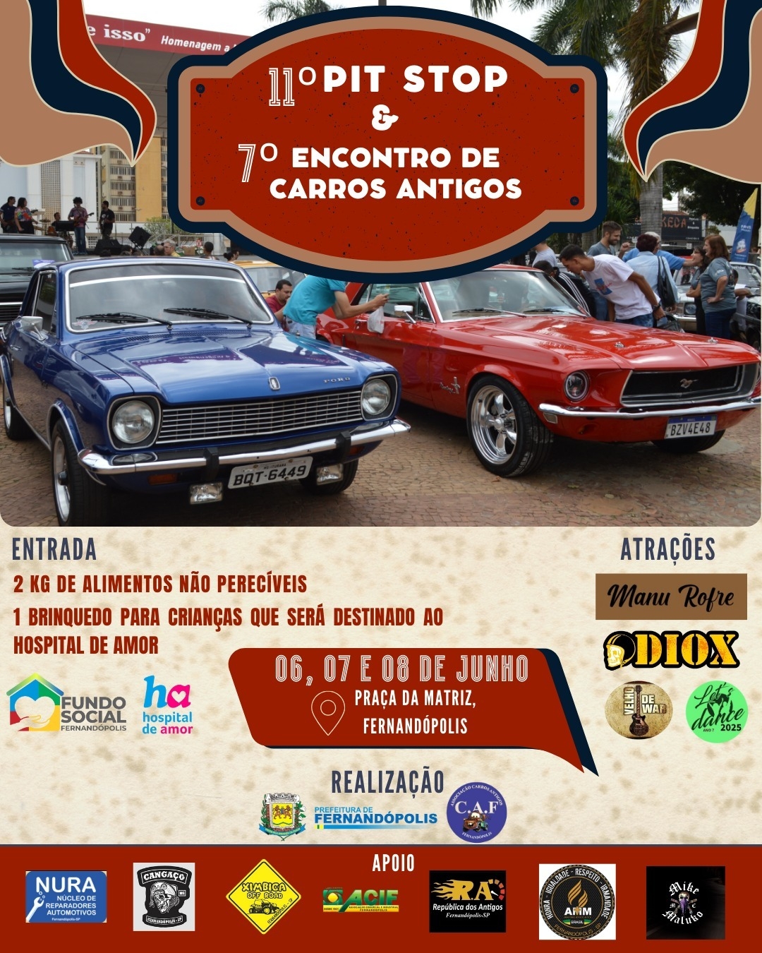 A Praça da Matriz de Fernandópolis receberá neste final de semana – sexta, sábado e domingo - o 11° Pit Stop e 7° Encontro de carros antigos, num evento que já faz parte do calendário cultural e social da cidade. Além da exposição de carros antigos, haverá ação solidária e atrações musicais.