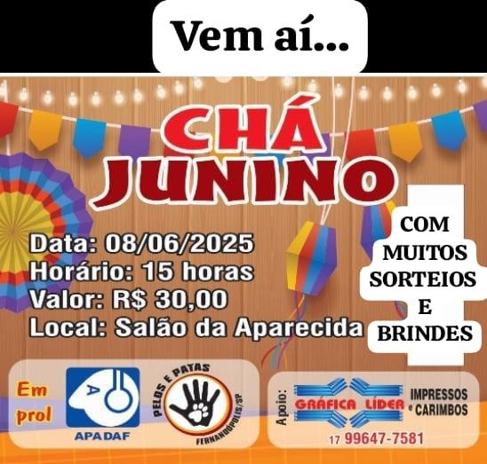 A ONG Pelos e Patas, que atua na defesa dos animais, e a Apadaf– Associação dos Pais e Amigos dos Deficientes Auditivos - de Fernandópolis realizam neste domingo, 8, mais uma edição do tradicional “Chá Junino”.