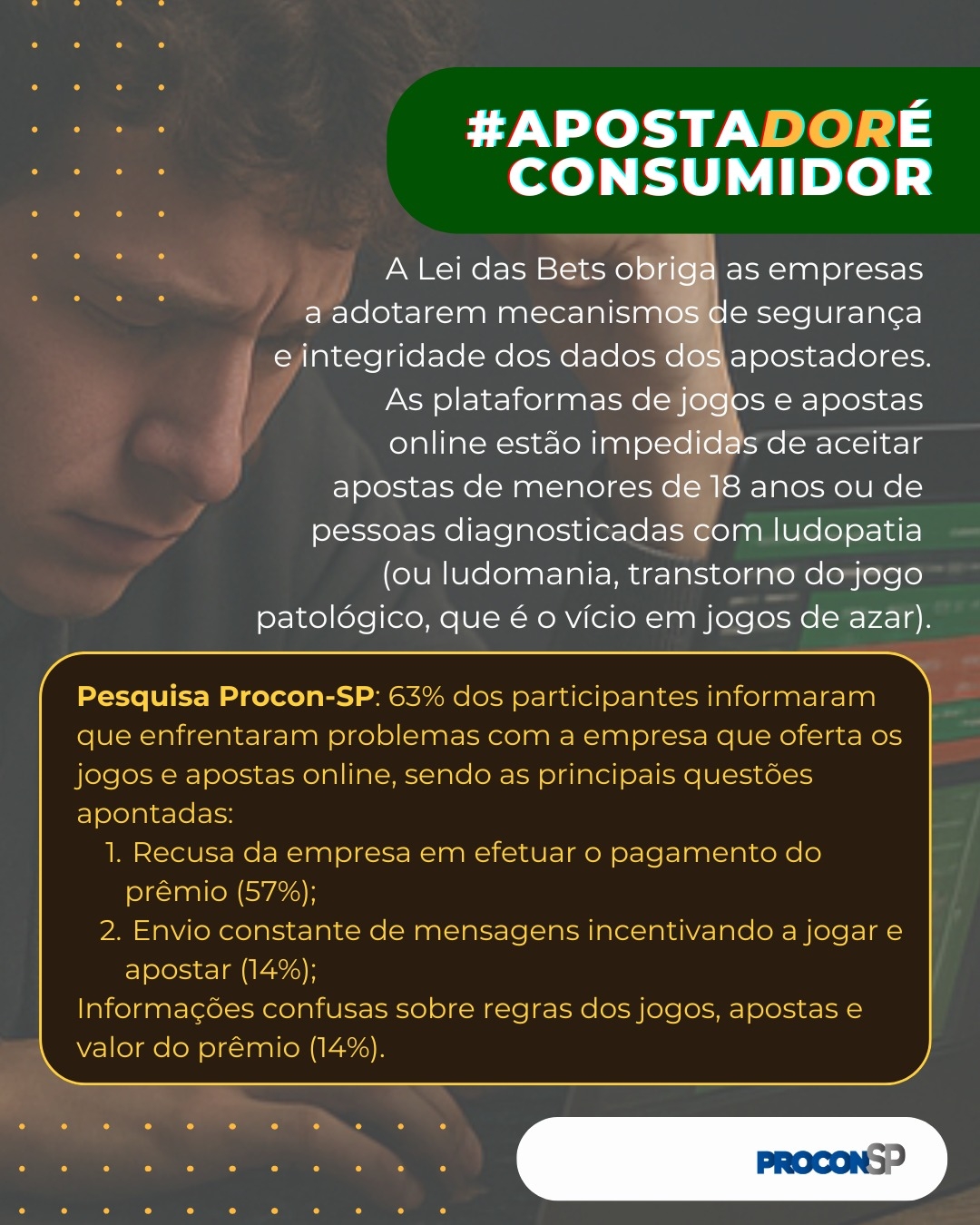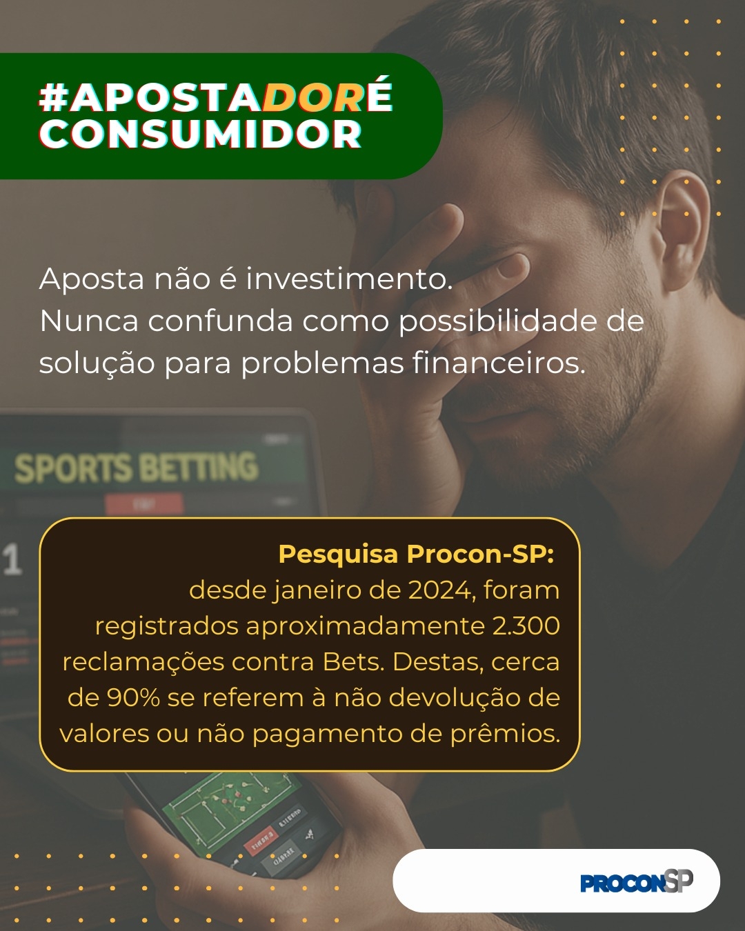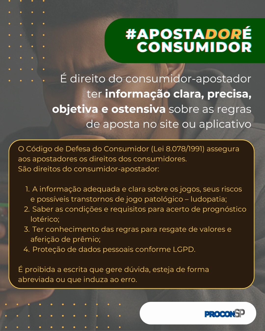 O Procon-SP lançou a campanha #ApostadorÉConsumidor, com o objetivo de alertar e orientar os consumidores sobre os riscos relacionados às apostas online. A ação ocorre em parceria com órgãos de fiscalização de todo o país e busca não apenas combater plataformas ilegais, mas também promover um ambiente mais seguro e transparente para quem utiliza esses serviços (veja abaixo).