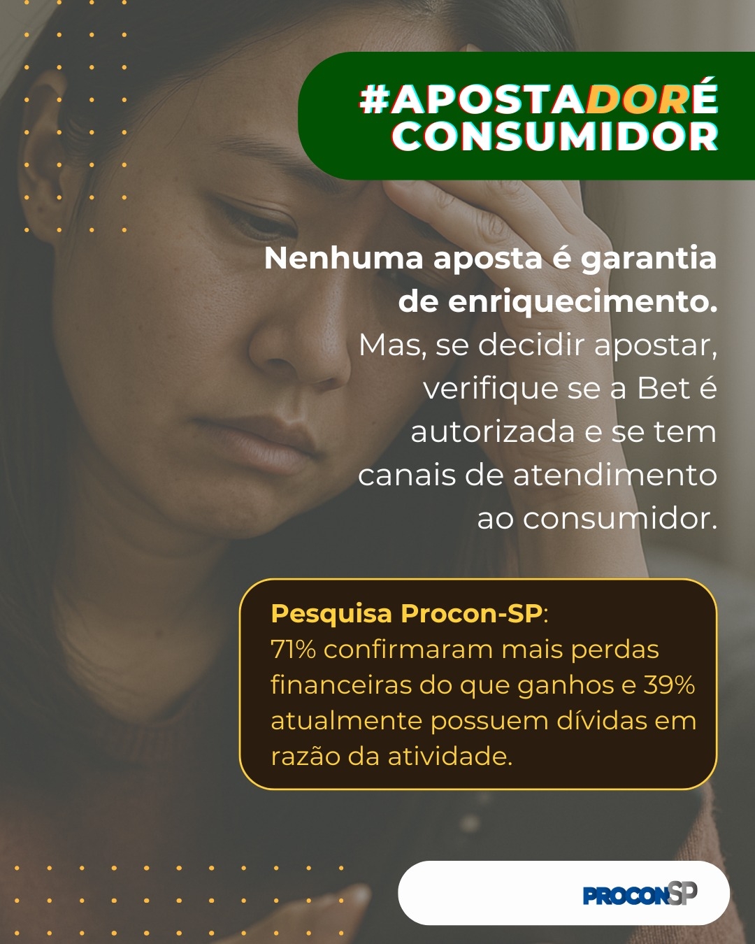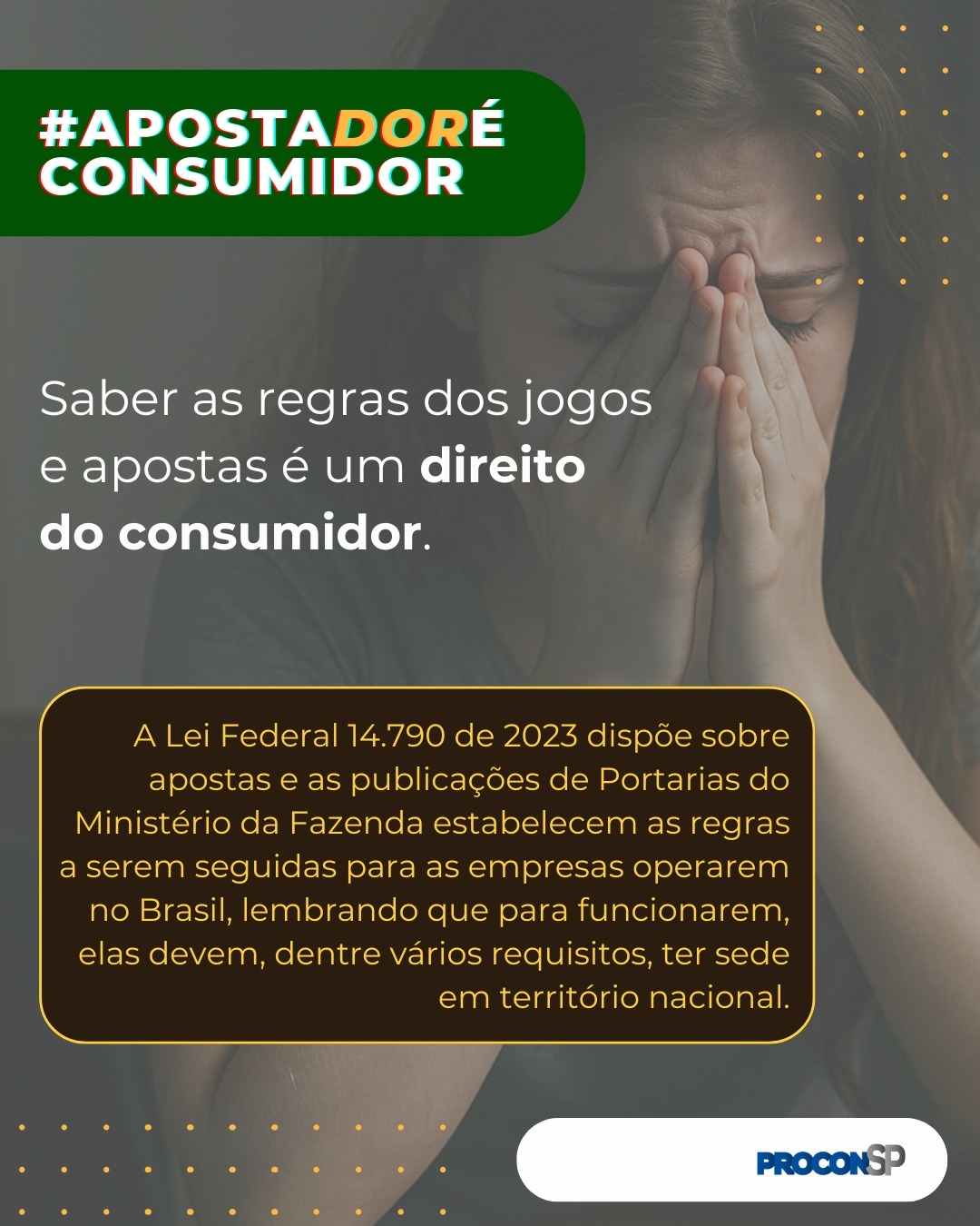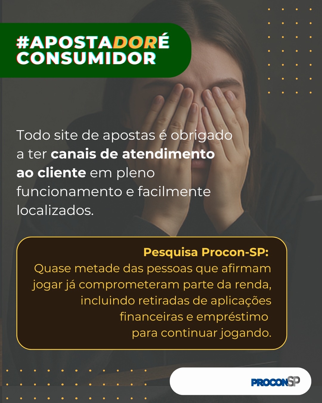 O Procon-SP lançou a campanha #ApostadorÉConsumidor, com o objetivo de alertar e orientar os consumidores sobre os riscos relacionados às apostas online. A ação ocorre em parceria com órgãos de fiscalização de todo o país e busca não apenas combater plataformas ilegais, mas também promover um ambiente mais seguro e transparente para quem utiliza esses serviços (veja abaixo).