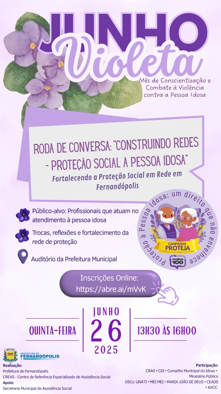 Neste domingo, 15 de junho, é celebrado o Dia Mundial de Conscientização da Violência contra a Pessoa Idosa. A Prefeitura de Fernandópolis, por meio do CREAS e com apoio da Secretaria Municipal de Assistência Social, promove no dia 26 de junho, das 13h30 às 16h, no Auditório do Paço Municipal, o evento “Construindo Redes – Proteção Social à Pessoa Idosa”, como parte da Campanha Municipal Proteja e da programação do “Junho Violeta.”